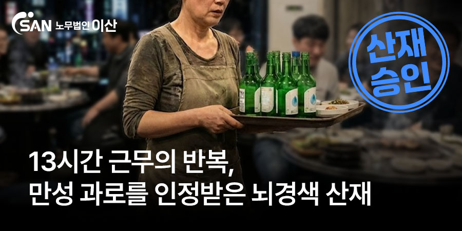 낮과 밤의 경계가 없는 삶, 뇌경색! 24시간 교대 근무자 산재 승인의 비밀은? 낮과 밤의 경계가 없는 삶, 뇌경색! 24시간 교대 근무자 산재 승인의 비밀은? Ⅰ. 사건의 배경 안녕하세요. 산재전문 노무법인 이산입니다. 이번 포스팅에서는 장기간 24시간 교대근무 체계 속에서 근무해 오시다 뇌경색이 발병하신 신청인분의 산재 승인 사례를 소개해 드리고자 합니다. 의뢰인께서는 오전 6시부터 다음 날 오전 6시까지, 하루 24시간을 근무지에서 보내는 교대근무 방식으로 일해 오셨습니다. 24시간 교대근무는 겉으로 보면 이틀에 한 번 출근하는 것처럼 보입니다. 그러나 실상은 다릅니다. 낮에는 각종 업무를 처리하고, 밤에도 자리를 지키며 언제든 대응할 수 있어야 합니다. 야간 휴게시간이 있다고 해도, 독립된 공간이 아닌 근무지에서 대기하는 구조라면 몸이 온전히 쉬는 시간은 따로 없는 셈입니다. 의뢰인께서는 이러한 환경 속에서 오랫동안 성실하게 일해 오셨습니다. 그러던 어느 날 갑자기 찾아온 뇌경색 진단은 의뢰인뿐만 아니라 가족들에게까지 큰 충격을 안겨주었습니다. "고혈압이 있었으니 그냥 개인 질환 아닐까?", "야간에 휴게시간이 있었으니 산재로 인정받기 어렵지 않을까?" 하는 막연한 불안감 속에서 저희 노무법인 이산을 찾아주셨고, 저희는 의뢰인과의 깊이 있는 상담을 통해 산재 신청을 함께 진행하게 되었습니다. Ⅱ. 사건의 주요 쟁점과 접근 방법 이 사건은 야간 휴게시간의 실질과 만성적 과중업무를 객관적으로 입증하는 것이 핵심이었습니다. 저희는 다음 세 가지 쟁점을 중심으로 사건을 풀어나갔습니다. 첫째, 야간 휴게시간의 실질을 밝히다 근로계약서에는 야간 휴게시간(22:00~06:00)이 명시되어 있었습니다. 사업주 측은 이를 근거로 실제 업무시간이 길지 않다고 주장할 수 있는 상황이었습니다. 그러나 중요한 것은 형식이 아니라 실질입니다. 의뢰인께서는 야간 휴게시간에도 독립된 휴게 공간이 아닌 근무지에서 대기하며 수시로 업무에 대응해야 하는 구조였습니다. 저희는 이 야간 시간이 실질적으로 업무시간에 포함되어야 함을 구체적으로 설명하는 데 집중했습니다. 둘째, 만성과로 요건을 수치로 입증하다 야간 휴게시간을 업무시간에 포함하면 발병 전 4주간 주당 평균 업무시간과 발병 전 12주간 주당 평균 업무시간 모두 법정 기준인 주당 84시간을 초과하는 것으로 확인되었습니다. 저희는 출퇴근 기록 등 객관적 자료를 토대로 만성과로 인정 요건이 충족됨을 수치로 명확히 제시했습니다. 셋째, 교대근무라는 가중요인을 강조하다 24시간 교대근무는 그 자체로 업무부담 가중요인에 해당합니다. 불규칙한 수면과 생체 리듬의 교란은 뇌혈관 건강에 장기적으로 영향을 줄 수 있습니다. 저희는 과중한 근무시간에 더해 교대근무 구조가 복합적으로 작용했음을 설명하여, 업무와 발병 사이의 상당인과관계를 설득력 있게 제시했습니다. Ⅲ. 사건수행 결과 마침내 의뢰인께서는 '업무상 질병'으로 인한 뇌경색 산재 승인이라는 소식을 접하실 수 있었습니다. 이는 단순히 경제적 보상을 넘어, '내 병이 일하다 얻은 것'이라는 정당한 인정과 함께 그동안의 고통과 노고에 대한 위로를 받으셨다는 의미가 큽니다. 이번 산재 승인으로 의뢰인께서는 앞으로의 치료 과정에 필요한 요양급여와 치료 기간 동안의 생활 안정을 위한 휴업급여 등 산재보험으로부터 정당한 보상을 받게 되셨습니다. Ⅳ. 산재전문노무사 의견 이번 뇌경색 산재 승인 사례는 24시간 교대근무 환경에서 근무하시는 많은 분들에게 중요한 시사점을 던져줍니다. 교대근무자 중에는 "야간 휴게시간이 있으니 산재가 어렵겠지"라고 지레 포기하시는 경우가 많습니다. 그러나 중요한 것은 휴게시간의 형식이 아니라, 실제로 몸이 쉴 수 있었는가입니다. 이번 사례는 야간 휴게의 실질을 구체적으로 밝히고, 만성과로 요건을 수치로 입증한다면 교대근무자도 충분히 뇌혈관 질환 산재 승인을 받을 수 있음을 보여주는 중요한 선례가 됩니다. 고혈압 등 기저질환이 있더라도, 업무상 과로가 발병에 기여했음이 인정된다면 산재 승인의 문은 열려 있습니다. 노무법인 이산은 근무의 형식이 아닌 실질을 분석하고, 보이지 않는 과로를 기록과 숫자로 드러냅니다. 포기하기 전에 먼저 상담해 보시길 권합니다.