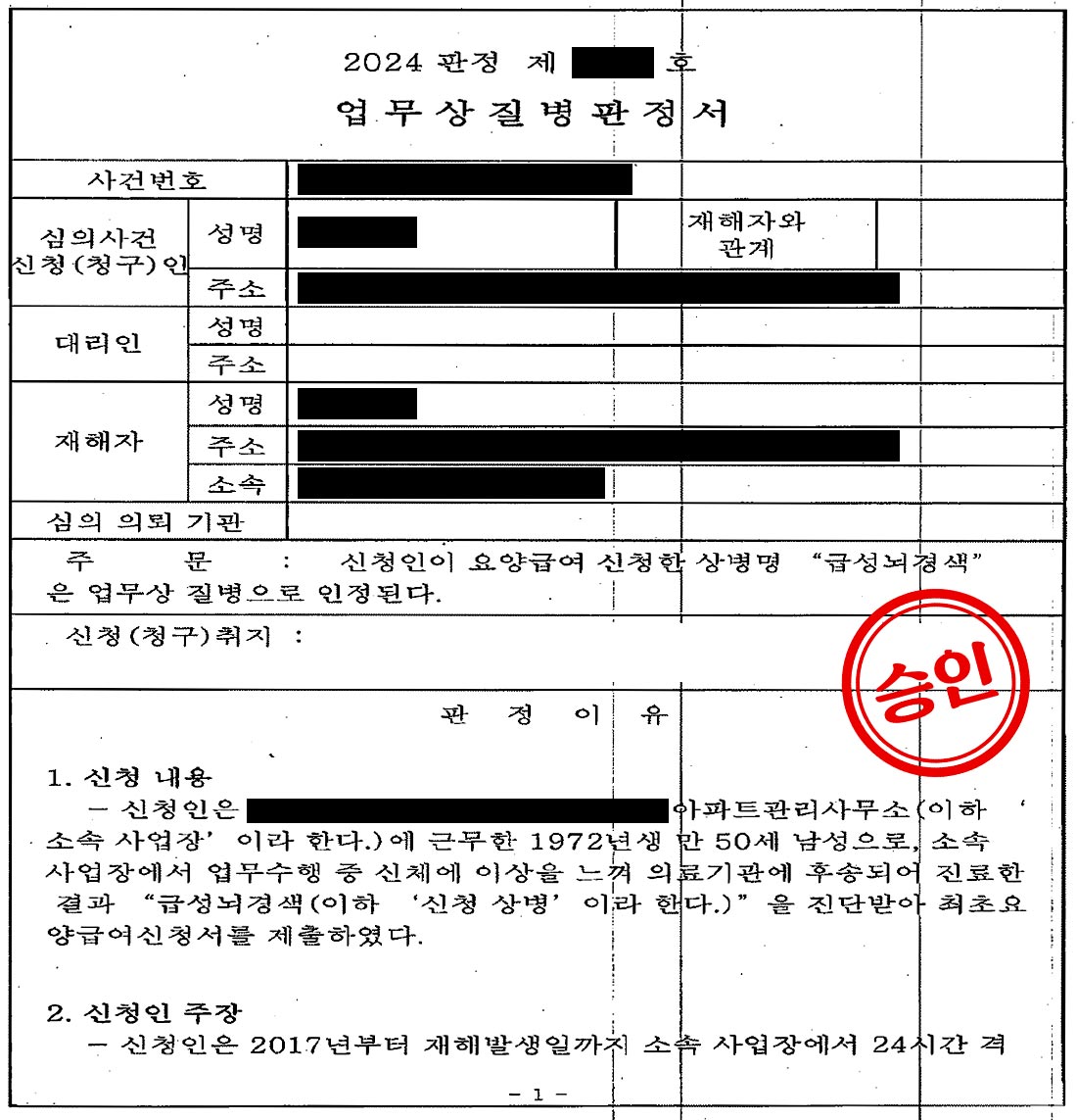오늘 소개해 드릴 사례는 아파트 시설관리 경비원으로 근무하던 중 급성뇌경색을 진단받고, 만성과로 기준 충족을 통해 업무상 질병으로 인정받은 50대 남성의 이야기입니다.