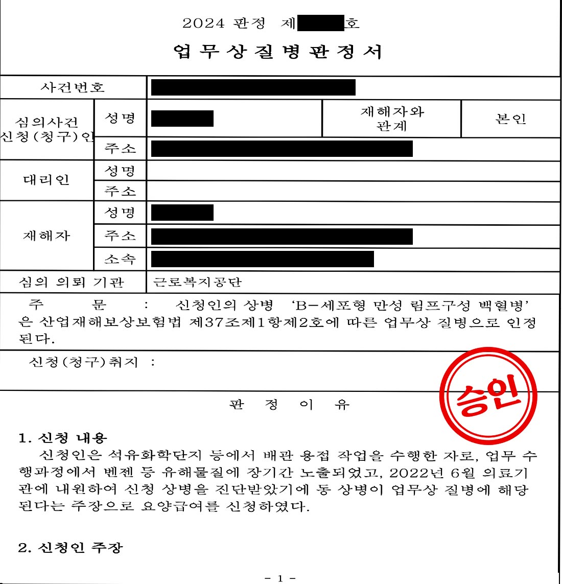 그 결과, 신청인의 ‘B-세포형 만성 림프구성 백혈병’은 업무상 질병으로 최종 인정되었습니다.